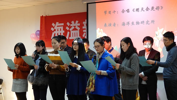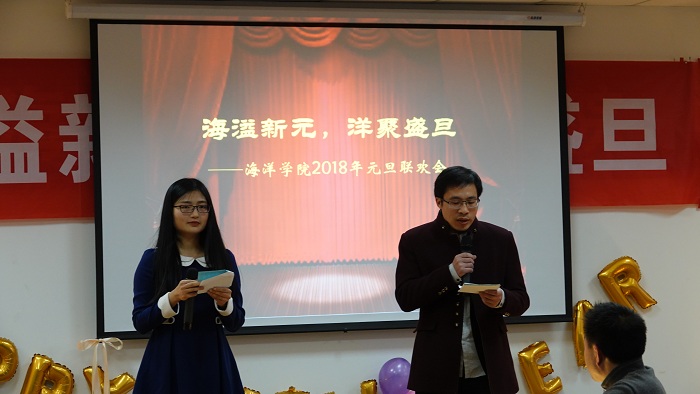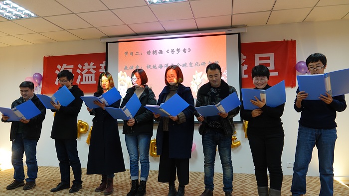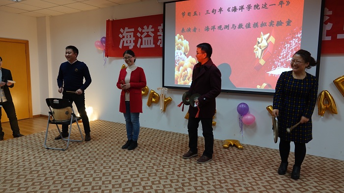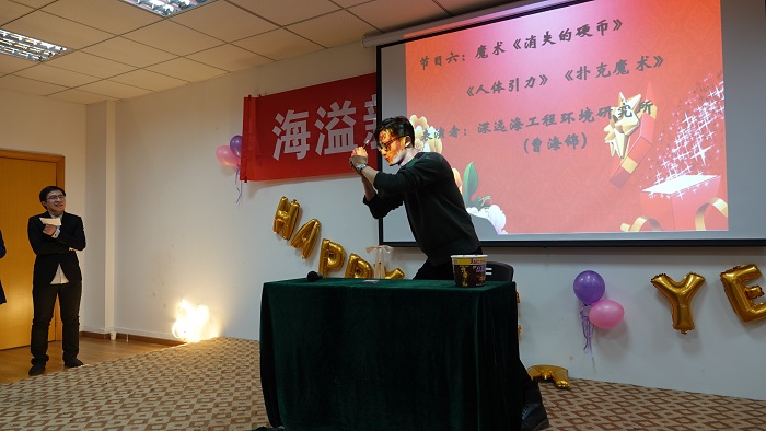 这一年》,既让我们感受到温馨的大家庭氛围,还让我们体会了对学院建设的真情洋溢;极地海洋与全球变化研究所的诗朗诵《寻梦者》、院办的诗朗诵《海之子》和海洋地质研究所的合唱《勘探队之歌》,道出了我们追寻海洋梦的澎湃心声;金兴坤、鲍威、王书昆、张帅等四位老师的歌曲串烧,点燃老师们年轻萌动的热火;深远海工程环境研究所曹海锦老师的魔术表演《消失的硬币》《人体引力》《扑克魔术》,带领我们进入神奇的魔术世界;海洋生物研究所的合唱《明天会更好》,更让我们斗志昂扬,带着期许走向明天。学生表演了助兴节目古筝独奏《女儿情》与舞蹈《告白气球》,尽显学生的青春活力和多才多艺。