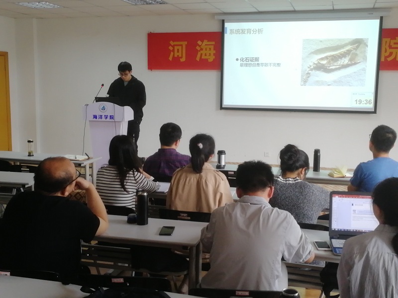 候睿同学以“水体有机污染物和紫外线辐射对近海浮游植物的耦合效应研究”为题,介绍了紫外辐射,有机污染物和光系统二的相关背景知识,以及它们之间的相互影响作用,并初步设计了之后将展开的实验。刘宇鹏同学汇报的题目是“弧菌的进化与环境适应”,主要利用全基因组测序技术和系统进化分析研究弧菌的进化与环境适应,更好的从属的角度了解弧菌。