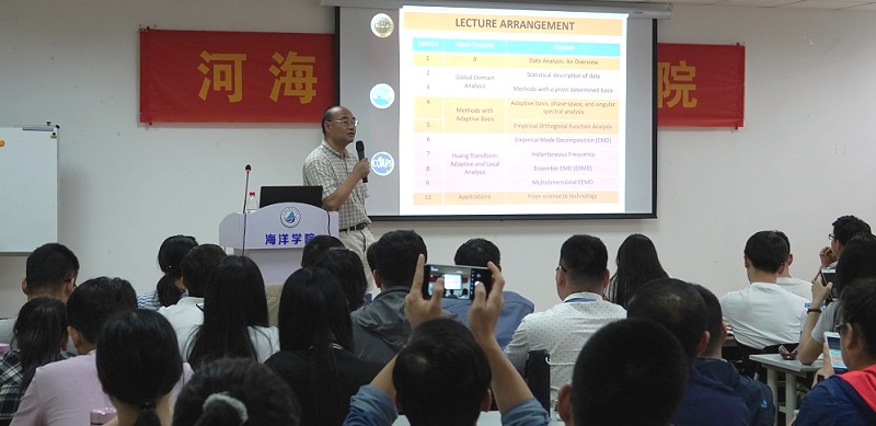 此次吴召华教授的数据的物理分析课程每天3个课时进行,通过对传统分析方法,特别是对气候和海洋研究中的常用方法仔细分析,揭示其优缺点和可适用性。由此进一步讨论数据分析的物理观念和约束数据分析的一些基本物理定律,着重介绍满足这些物理约束的黄变换(希尔伯特-黄变换)的一系列方法,实现从数据的数学分析向物理分析的跨越。课程初期,吴召华教授用简洁风趣的语言为同学们介绍了概率统计的起源和发展。通过举例为同学们讲解了概率统计中的概念及定理;概率统计中存在的独立、包容的关系;概率的正规分布、开平方分布等。吴召华教授指出概率统计在研究方法上有它的特殊性,要在研究学习中灵活应用,并实际举例概率在EL Nino- Southern oscillation的应用。