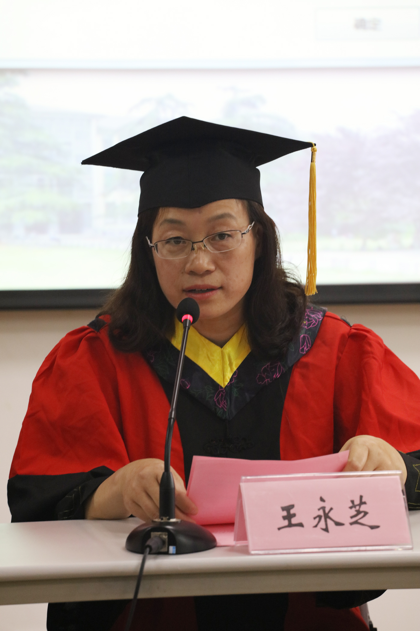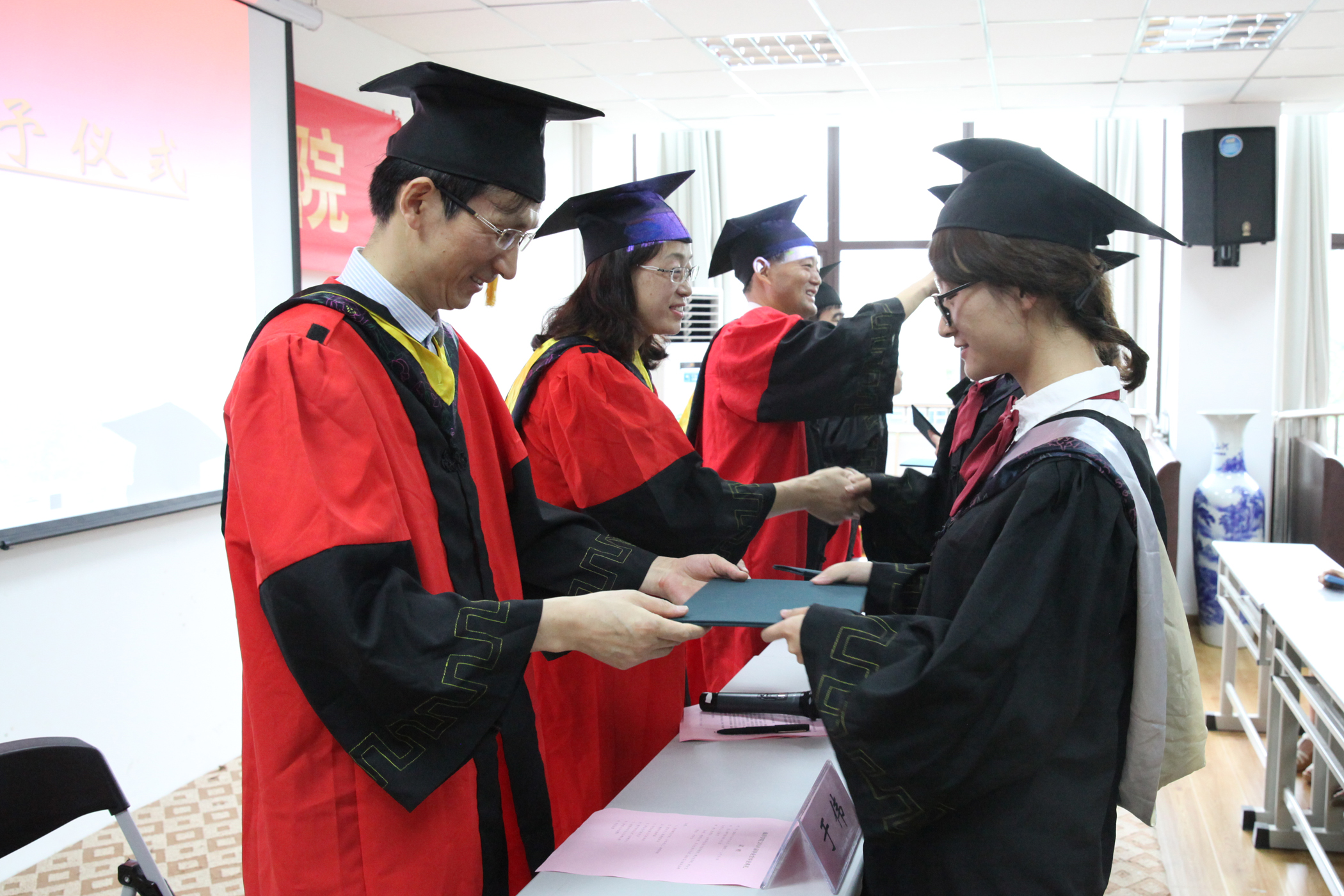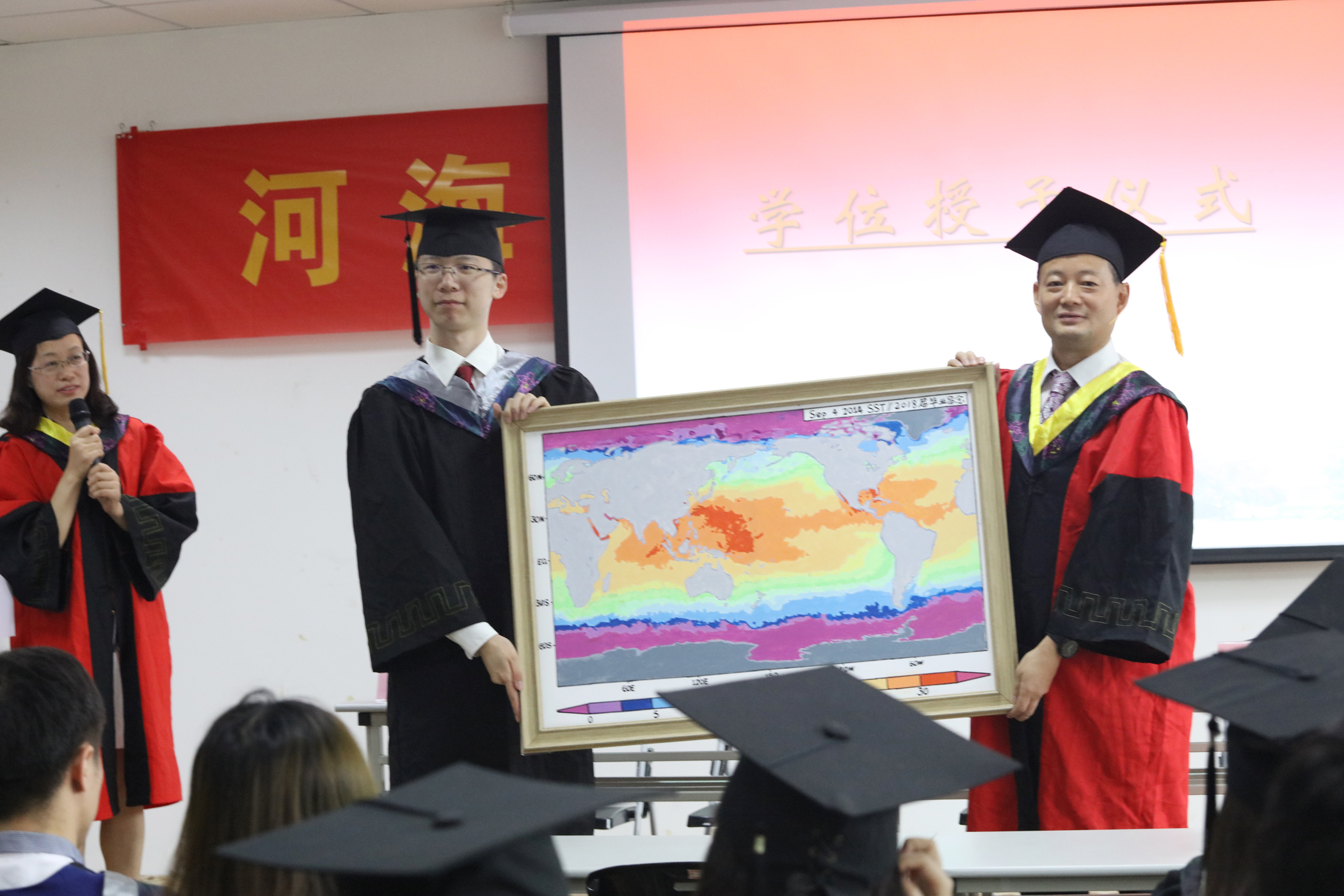 接下来由齐义泉院长、白学志院长、于伟院长、王永芝书记为每个毕业生进行了授予学位仪式,齐义泉院长代表学院赠与全体毕业生刻有学生姓名学号的纪念戒指,王嘉祯同学代表全体毕业生回赠学院2014年9月4日全球SST夜光油画图。