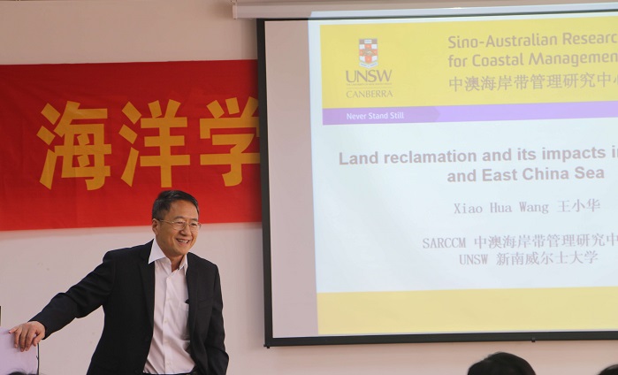王小华教授毕业于中国海洋大学,拥有澳大利亚詹姆斯库克大学物理海洋学博士学位,现任澳大利亚新南威尔士大学国际学生招生办公室主任(亚太区)及澳大利亚新南威尔士大学中澳海岸管理研究中心创始主任。同时,还任《河口海岸与陆架科学》以及《湖泊学与海洋学:方法》副主编。讲座中,王教授围绕围垦对海洋动力环境造成的影响这一主题,分别以胶州湾和苏北浅滩为例,深入浅出地介绍了其团队的最新研究进展。与会师生针对围垦引起的潮汐潮流变化、泥沙冲淤等学术问题,以及中澳研究生联合培养方式等问题,与王教授展开了热烈的讨论,气氛十分活跃。