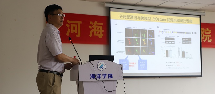 本次报告中,王群教授首先针对节肢动物门特有的唐氏综合症细胞黏附分(Dscam)基因转录过程中存在的可变剪切这一现象,从该功能基因在转录水平的分子多样性产生和调控机制以及在翻译水平其蛋白分子功能特异性这两个层面的科学问题展开报告。随后,王群教授以洄游性水生甲壳动物中华绒螯蟹为例,借助生物化学,细胞生物学和微生物学等手段,通过功能缺失和功能获得等实验手段深入解析了高度分子多样性Dscam其可变剪切异构体蛋白在该物种中的病原识别特异性,以及跨膜型和分泌型Dscam蛋白通过分子相互作用参与调控宿主吞噬病原微生物的分子机制。以上研究对于更好地认识无脊椎动物免疫防御机制提供了重要的基础,并为深入理解先天免疫系统在不同生物类群中的发展和演化机制带来了新的视角。报告后,王群教授与色情直播平台 师生对无脊椎动物先天免疫特异性分子机制和相关功能研究方法等问题进行了深入的讨论与交流,进一步促进了色情直播平台 师生对水生无脊椎动物免疫防御过程中的特异性识别和信号传导等分子机制的认识,开拓了师生们的学术视野。