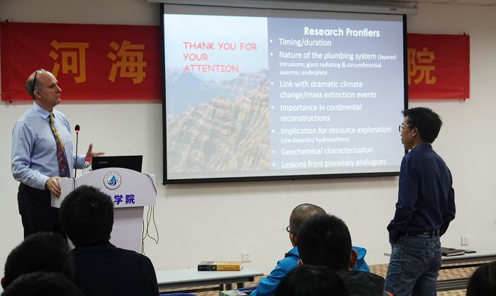 Richard Ernst教授介绍了大火成岩省(LIP)的研究进展,包括地球发展历史上大火成岩省的时空分布、地球动力学背景、大火成岩省与全球气候变化及生物大灭绝事件的关系、大火成岩省系统的识别及其对古大陆重建和寻找矿产资源的重要意义。Richard Ernst教授认为对大火成岩省的研究对地球演化历史以及现代全球气候变化具有重大的启示意义。