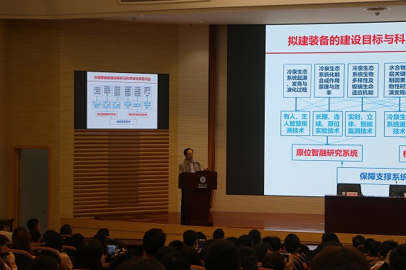 报告会上,张偲院士讲解了冷泉生态系统研究装置助力可燃冰安全开采的背景与意义、发展趋势、科学目标与科学问题、建设内容、基础条件等五个方面的内容。他指出开展冷泉生命系统与可燃冰生态效应研究,是响应国家能源战略、发展战略的重要体现,服务可燃冰开发将带动海洋高新技术发展与装备研发,推动深远海科技进步。