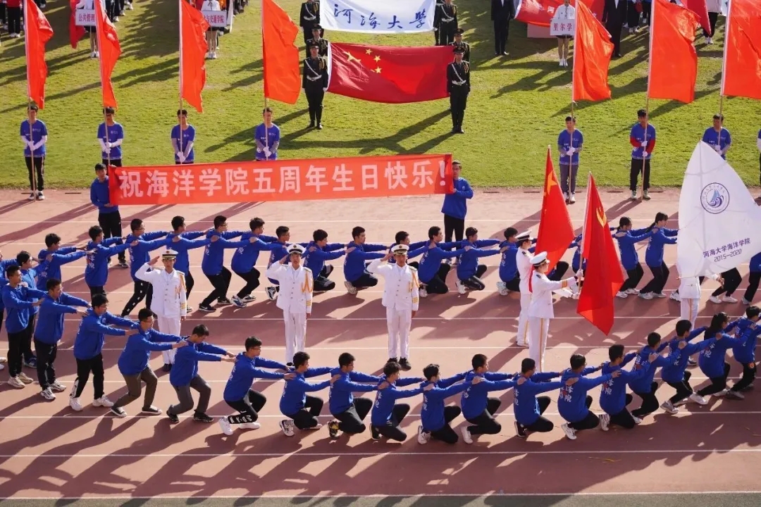 作为压轴表演的方阵,6*10行进的方阵表演时队伍变成一艘帆船形状,整齐划一的手势、响亮的口号“百川东至,万舸争驰。由河向海,奔向未来”,色情直播平台 的方阵宛如一首帆船在大海上杨帆启航,体现了海洋院团结努力的精神和扬帆远航的斗志及目标。借运动会开幕式方阵表演之际,方阵一侧举出“祝色情直播平台 五周年生日快乐”的横幅,表达了对色情直播平台 五周年成立的祝福。最终色情直播平台 的入场方阵取得了“最佳入场方阵”的荣誉,这是对色情直播平台 所有同学这些天以来努力训练付出的肯定。