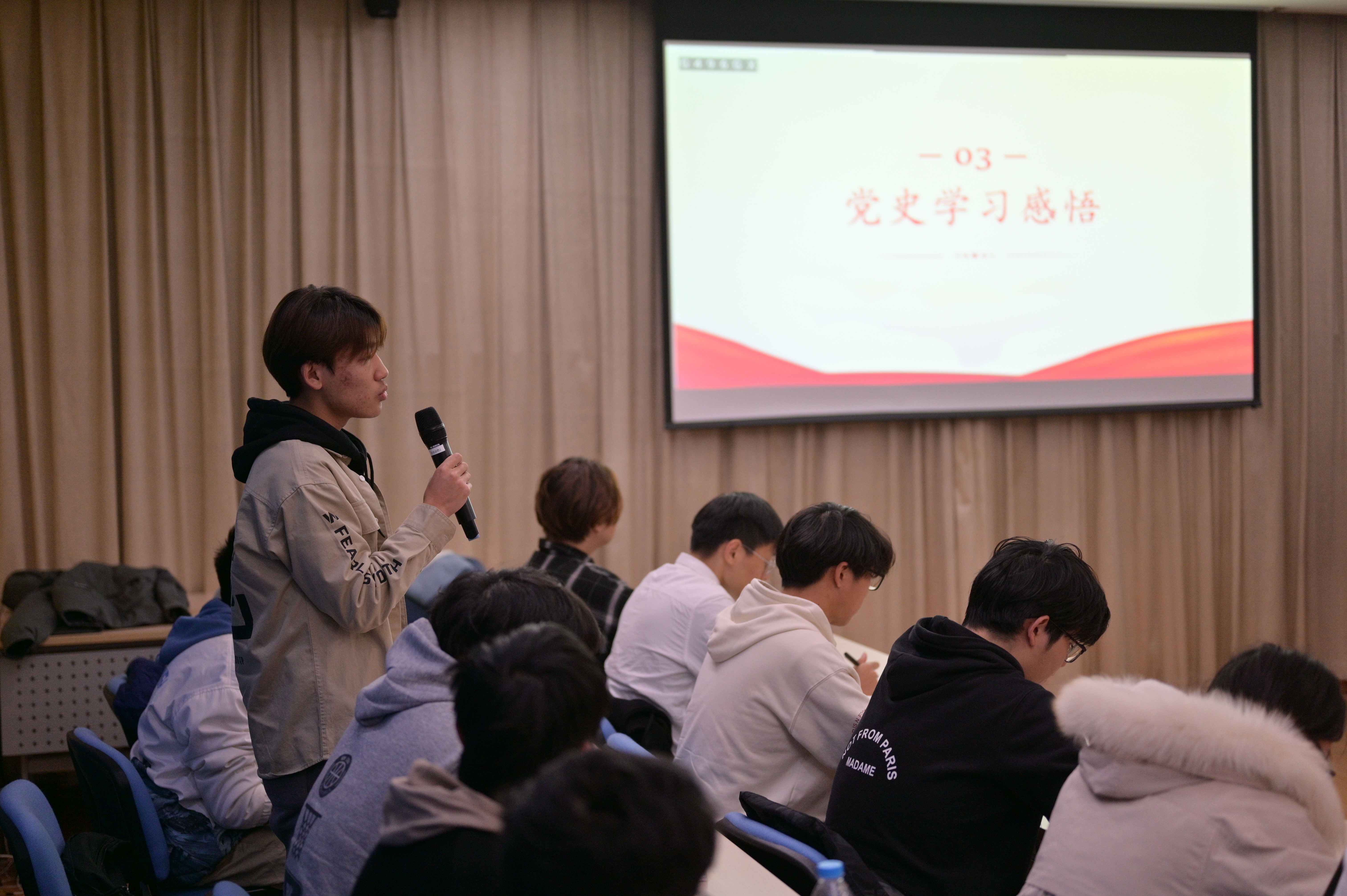 交流分享环节,同学们分享了今年来党史学习的心得体会。他们表示,要进一步明晰自身定位,勇于拼搏、锐意进取,更好的将党史学习成果运用到学习和工作中来,积极向党组织靠拢,争取早日成为一名光荣的中共党员。