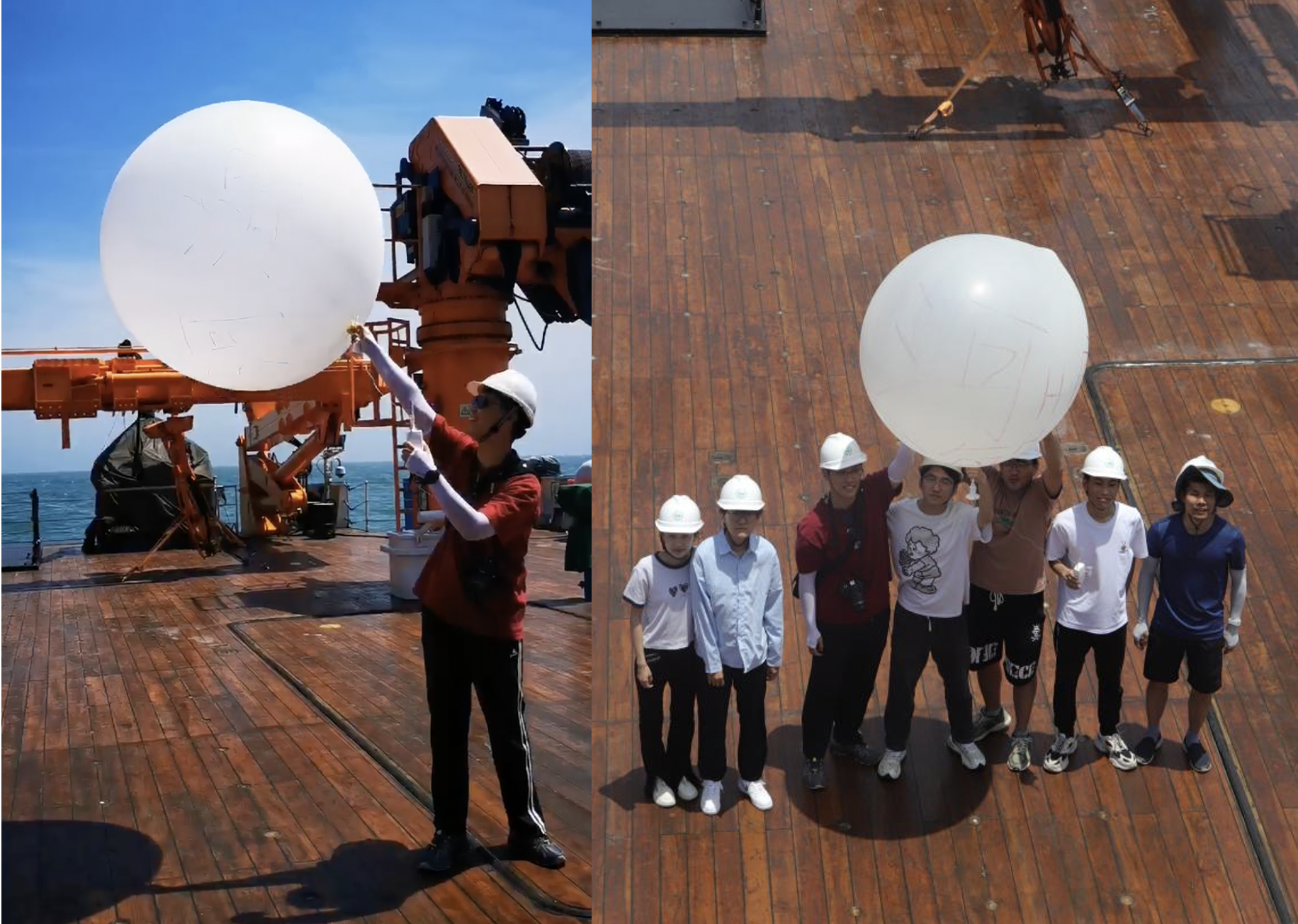 7月7号上午,“中山大学”号航行至台州沿岸海域站位,当天天气海况较差,遭遇了7级阵风,8级大浪,但色情直播平台 六名学生经受住了大风大浪的考验,克服了晕船的不适,顺利完成了海洋气象观测实习内容。韩博副教授介绍探空仪器使用方式后,色情直播平台 师生成功放飞探空气球,并在实验室实时读取传感器得到海上不同高度温度、气压、风速、空气湿度等海洋气象数据。随后在周海涛工程师的介绍下,了解学习了微波辐射计、激光风廓线雷达等气象观测仪器的使用及数据读取方式。在完成当天科考作业后,全体船员及参航师生进行了安全演习,熟悉了各项救生装置的使用及位置。