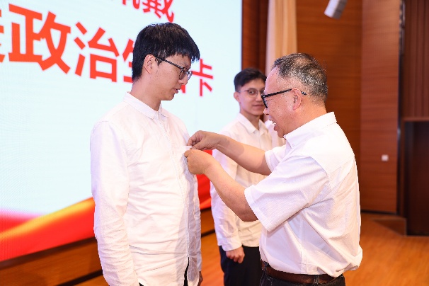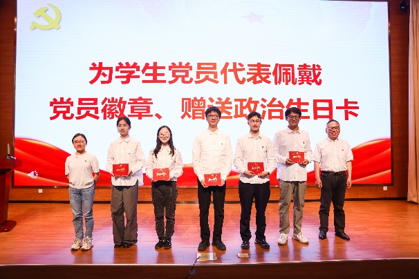 为赓续党的光荣传统,会上,由党委书记胡忠华和组织员阮雪琴共同为各支部毕业生党员代表佩戴党徽、赠送印有党员姓名、入党时间及入党誓词的“政治生日”贺卡,这不仅是一次引领党员亮身份、做表率的契机,更是传递温情与关爱、寄予殷切嘱托与期望的重要体现。通过党员参与式的仪式教育,勉励各位党员要努力践行入党初心,认真履行党员义务,为共产主义事业奉献力量。