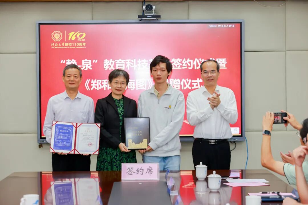 双方签署“静-泉”教育科技基金捐赠协议,郑金海向齐义泉及家人颁发捐赠证书及捐赠鸣谢牌,并为王静颁发名誉校友证书。