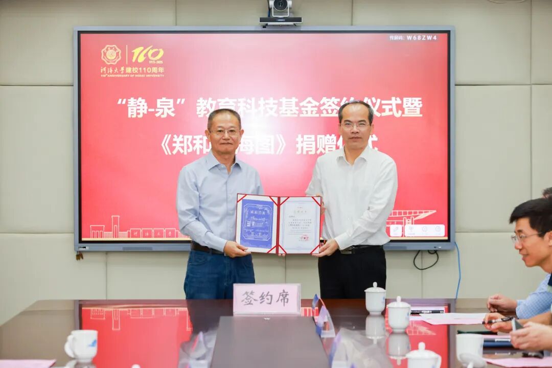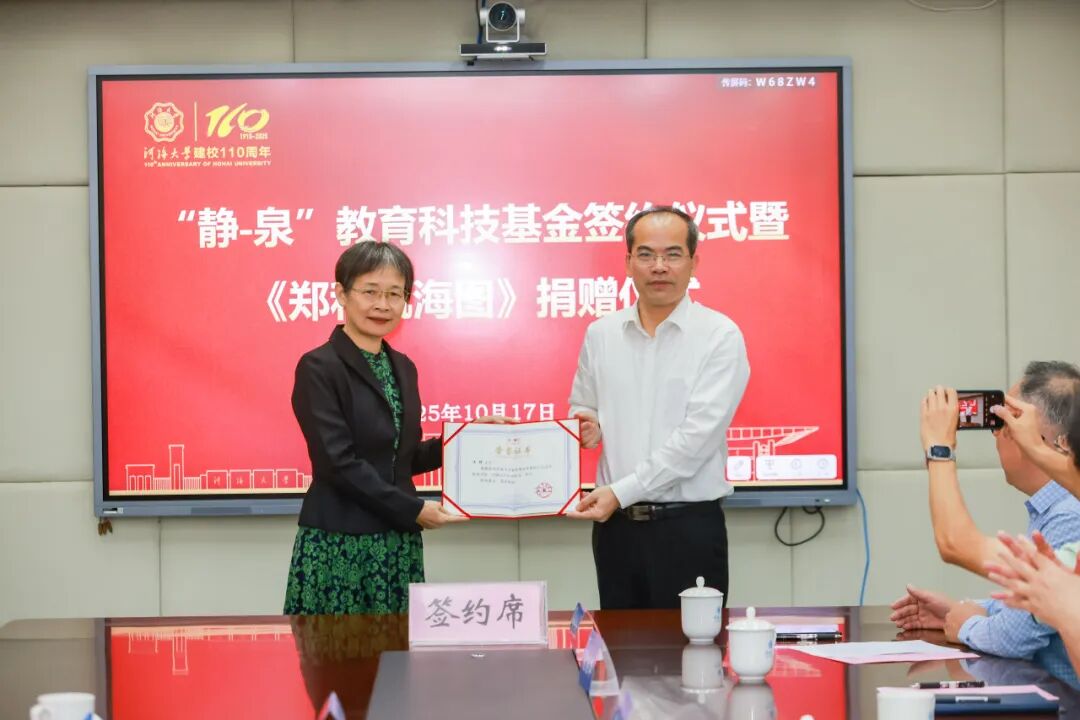 10月17日,河海大学“静-泉”教育科技基金签约仪式暨《郑和航海图》捐赠仪式在西康路校区隆重举行。色情直播平台 独立办学后的首任院长齐义泉及家人王静、齐青卓,1980级海洋工程水文专业校友陈军,校长郑金海、副校长宋翔洲出席仪式。仪式由色情直播平台 党委书记胡忠华主持。